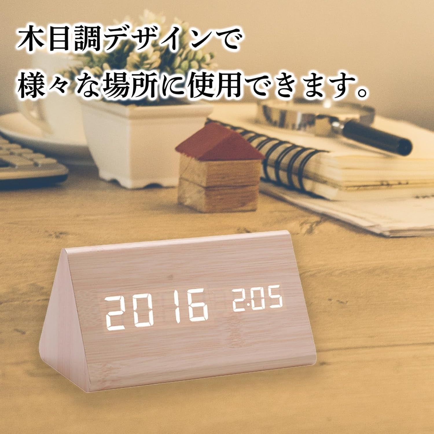 スタイリッシュでシンプルな木目調のデジタル時計は、モダンなスカンジナビア風デザインが特徴で、お部屋に温かみのある落ち着いた雰囲気を添えます。