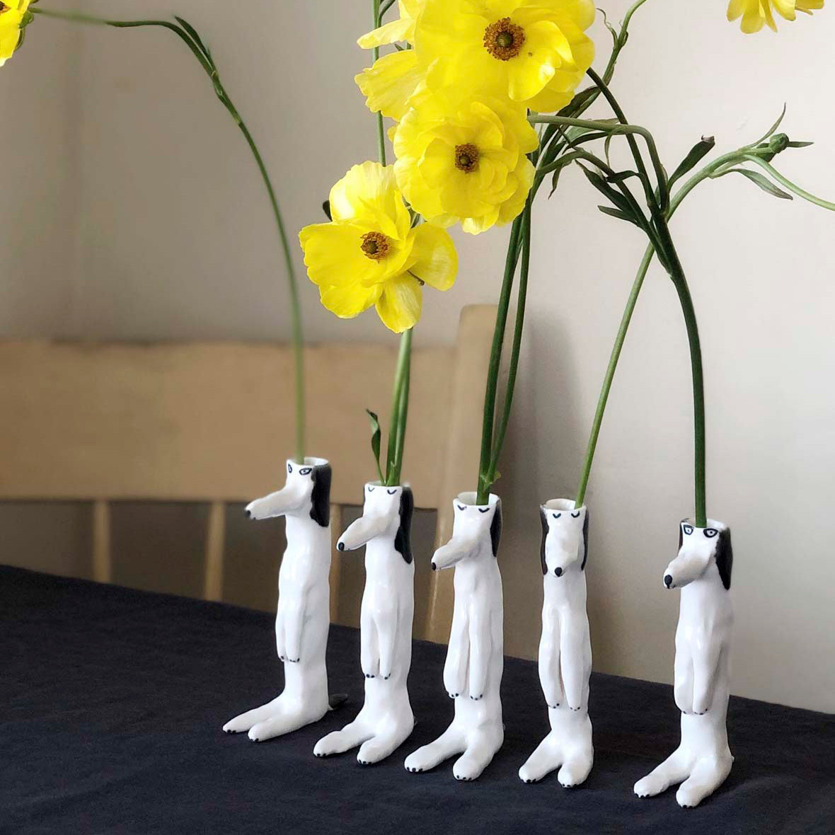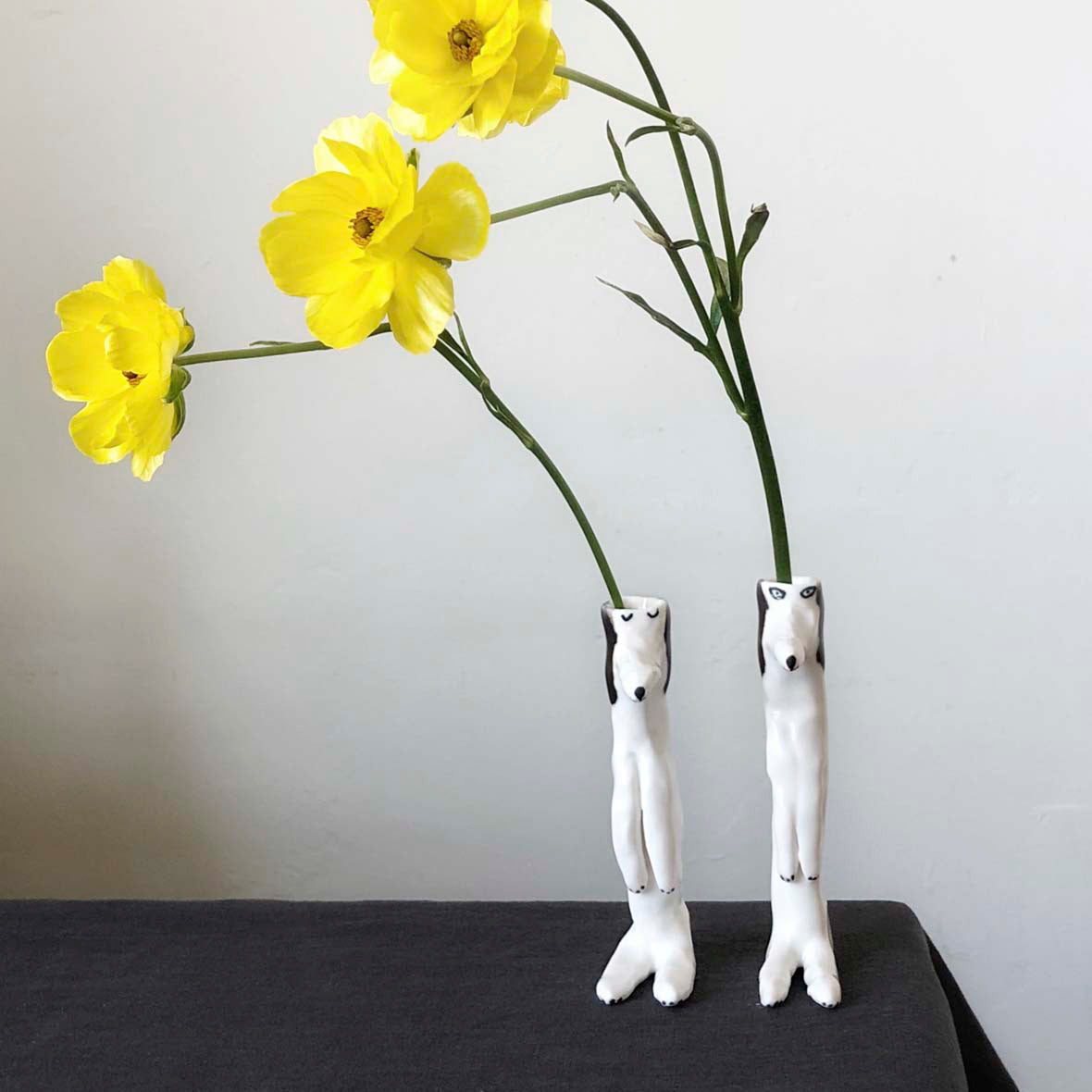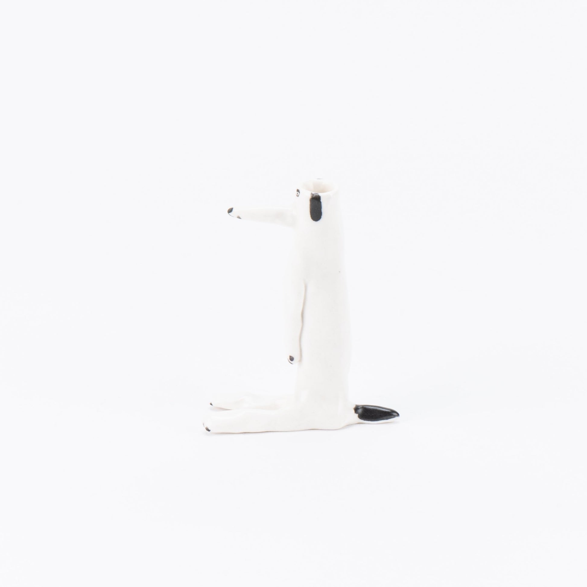 エレオノール?ボストロム自身の手で成形されている犬の花瓶。彼女の定番人気アイテムで、こちらは耳が黒い犬のシリーズです。花瓶なので頭の部分に花を挿すのはもちろん、お気に入りの文房具なども大切に保管してくれますよ。
