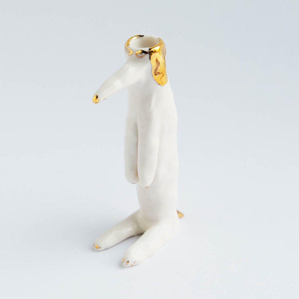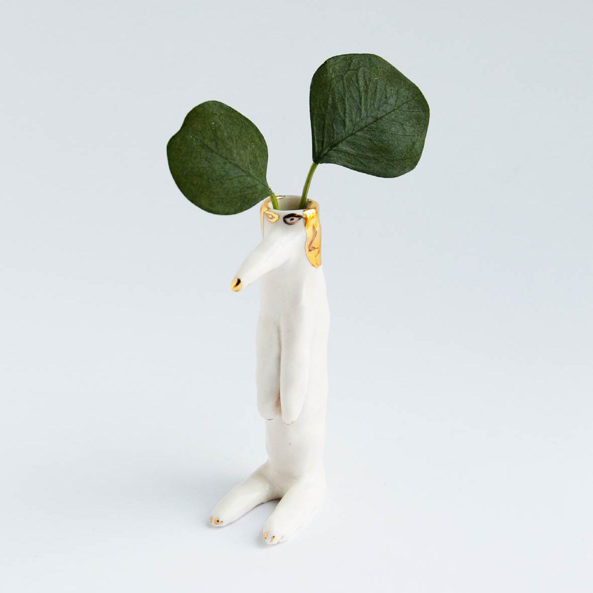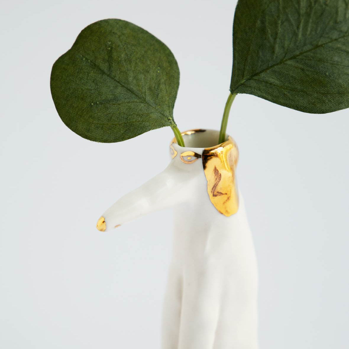 エレオノール?ボストロム自身の手で成形されている犬の花瓶。彼女の定番人気アイテムで、こちらはキラキラと輝くゴールドの釉薬(ゆうやく)を使ったシリーズです。花瓶なので頭の部分に花を挿すのはもちろん、お気に入りの文房具なども大切に保管してくれますよ。
