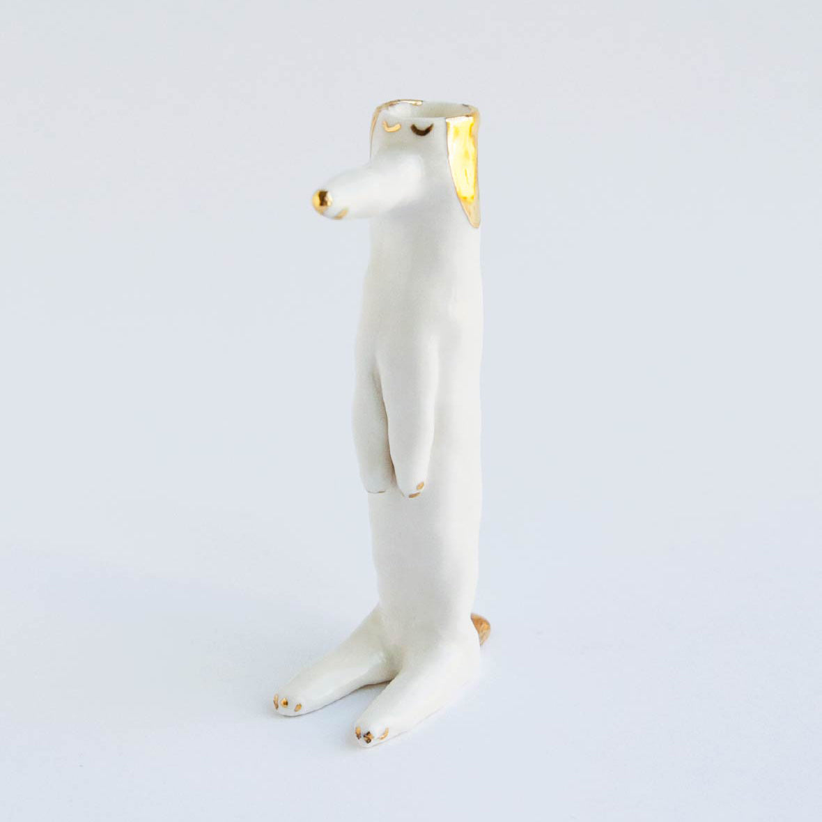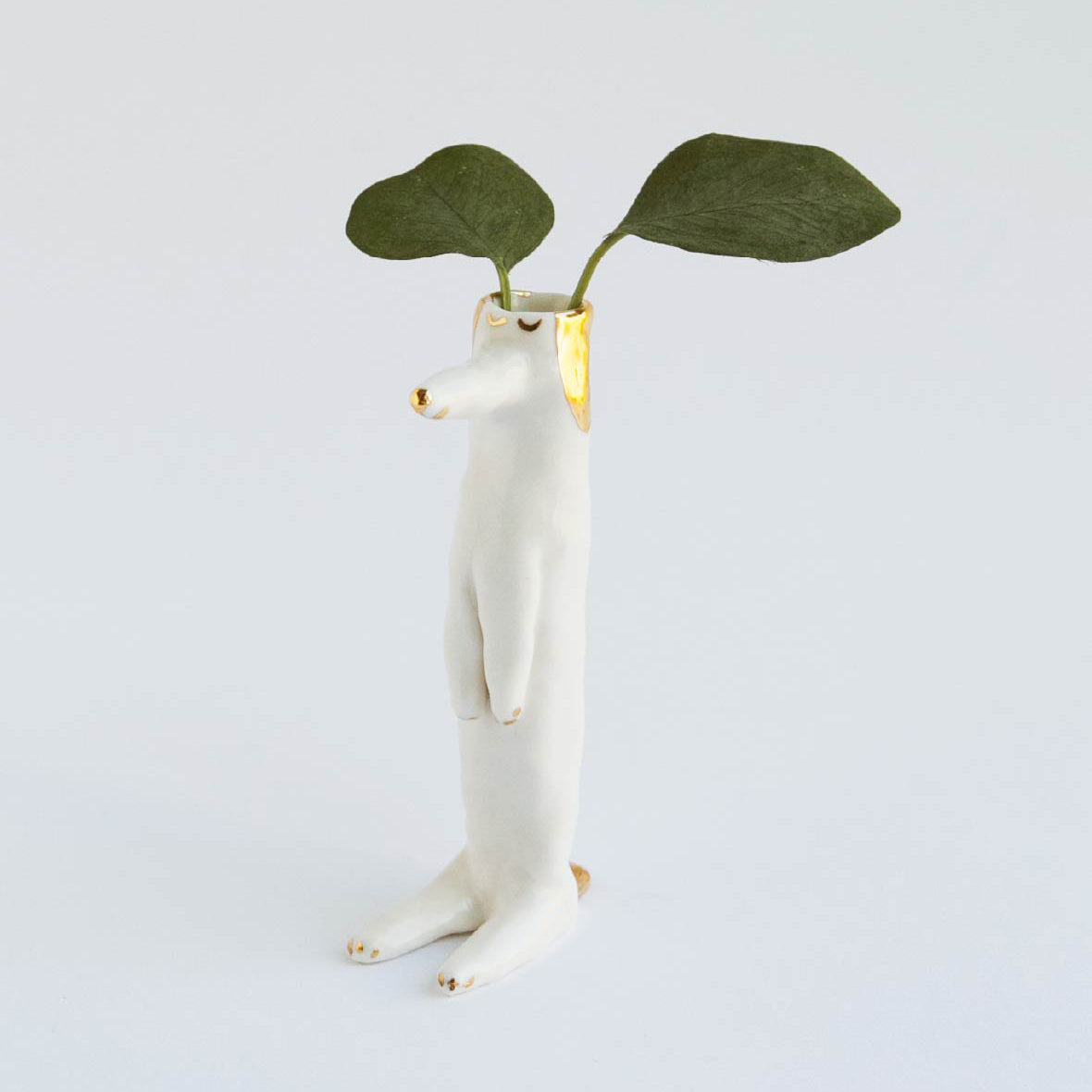 エレオノール?ボストロムの犬がおすわりをしているような花瓶です。頭の部分に一輪程度の花を活けることができます。手書きの顔はゴールドで1体1体個性豊かな表情が描かれており、手作りの温もりを感じられるフォルムがほっこり感でいっぱいです。