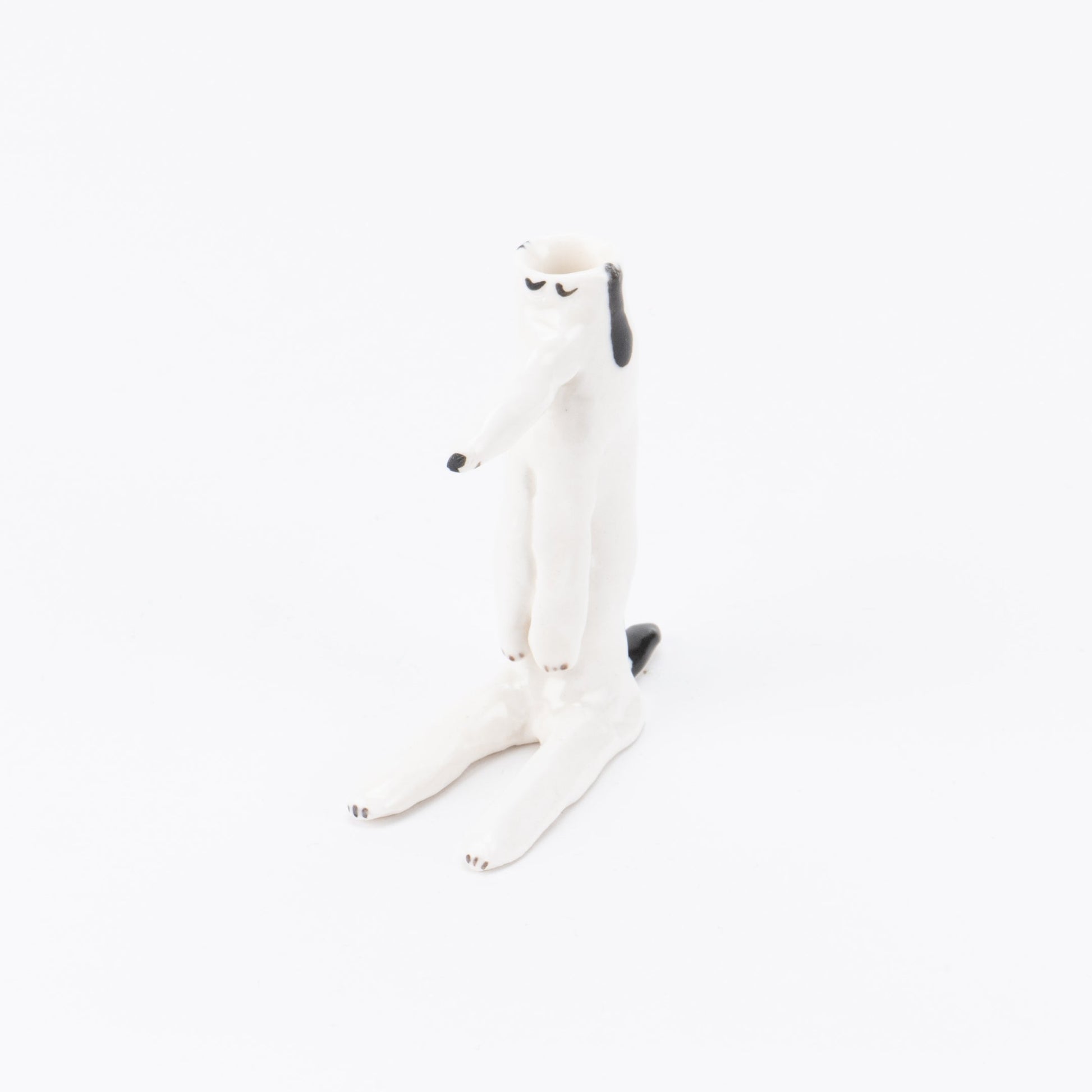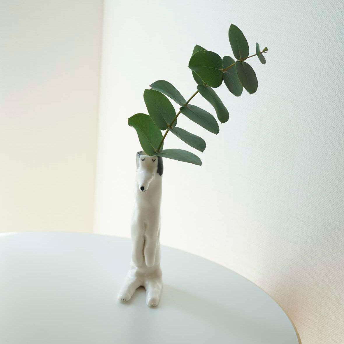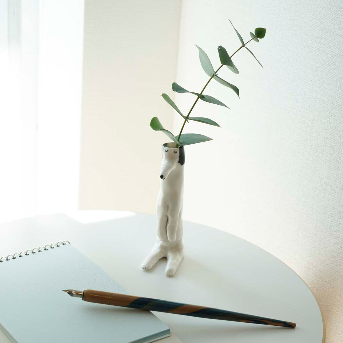 エレオノール?ボストロム自身の手で成形されている犬の花瓶。彼女の定番人気アイテムで、こちらは耳が黒い犬のシリーズです。花瓶なので頭の部分に花を挿すのはもちろん、お気に入りの文房具なども大切に保管してくれますよ。