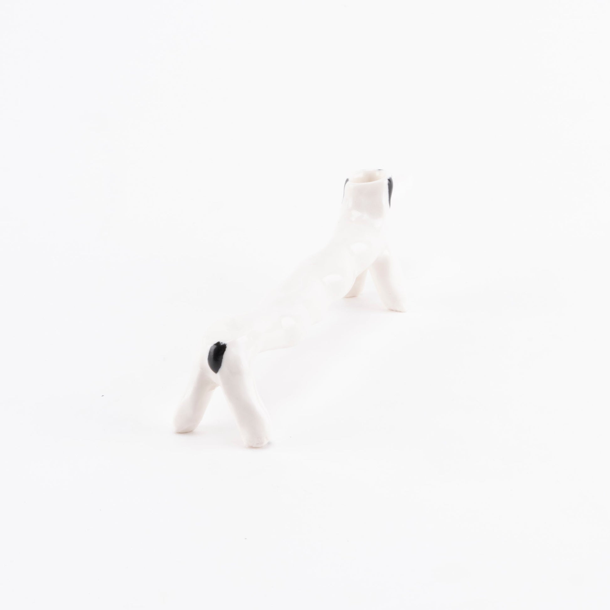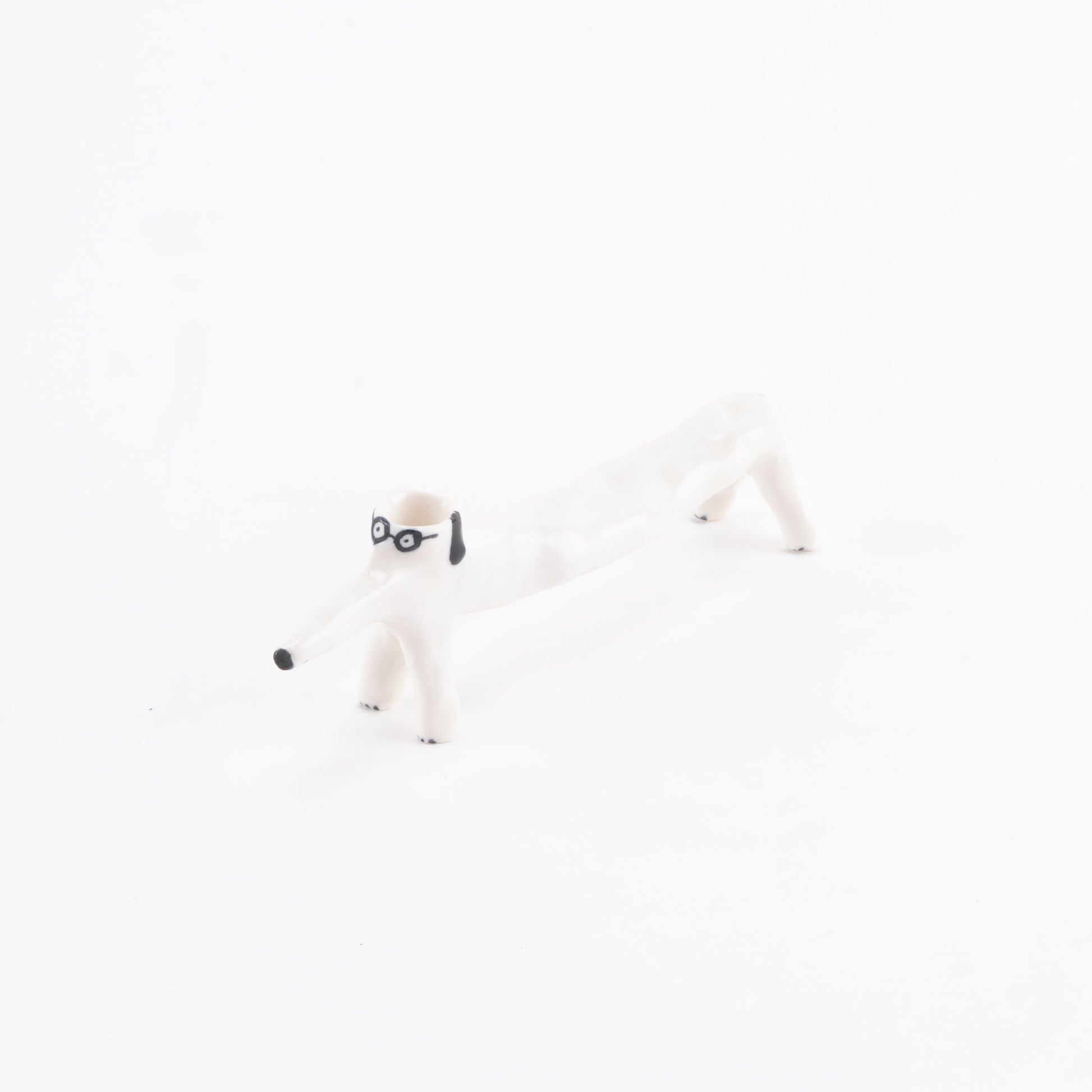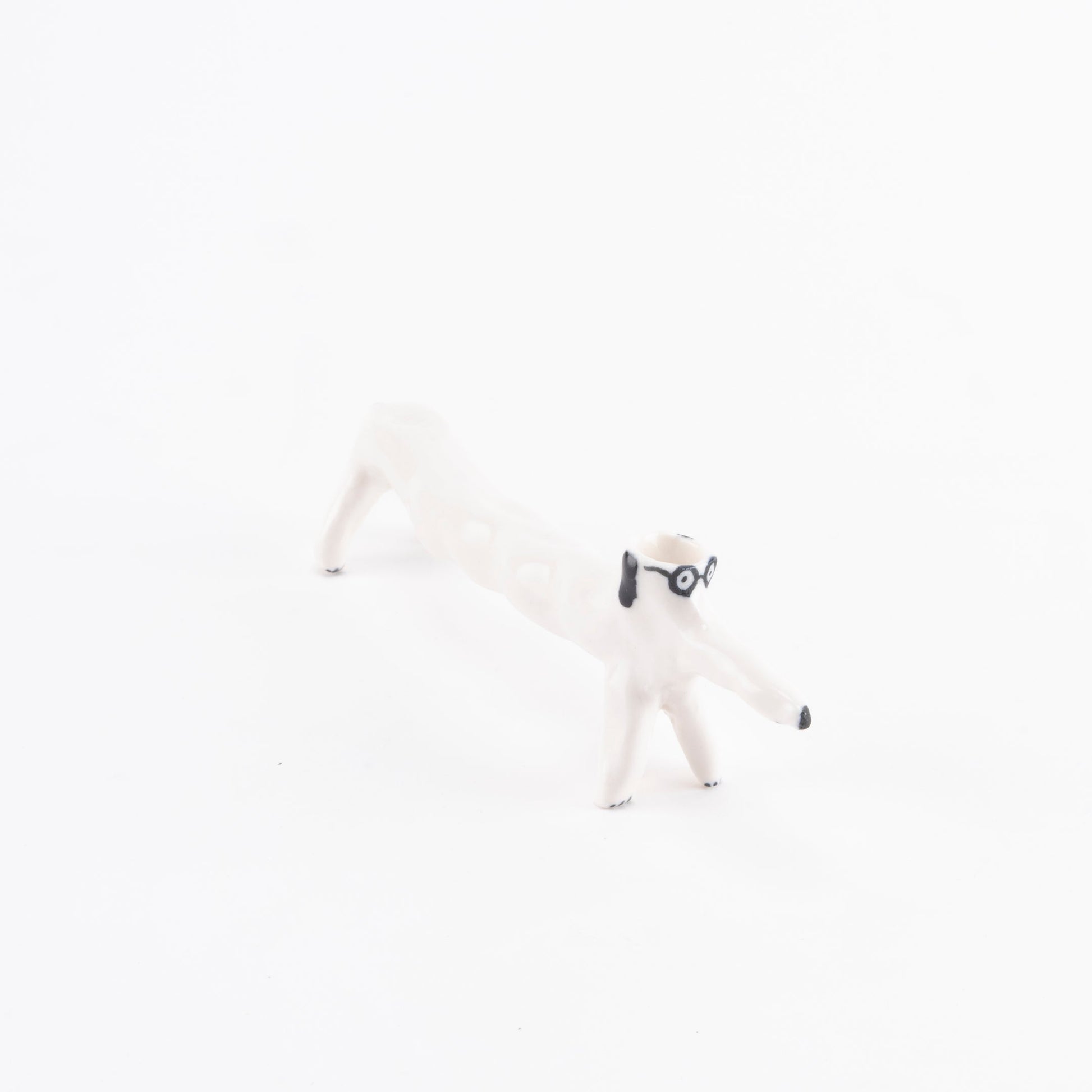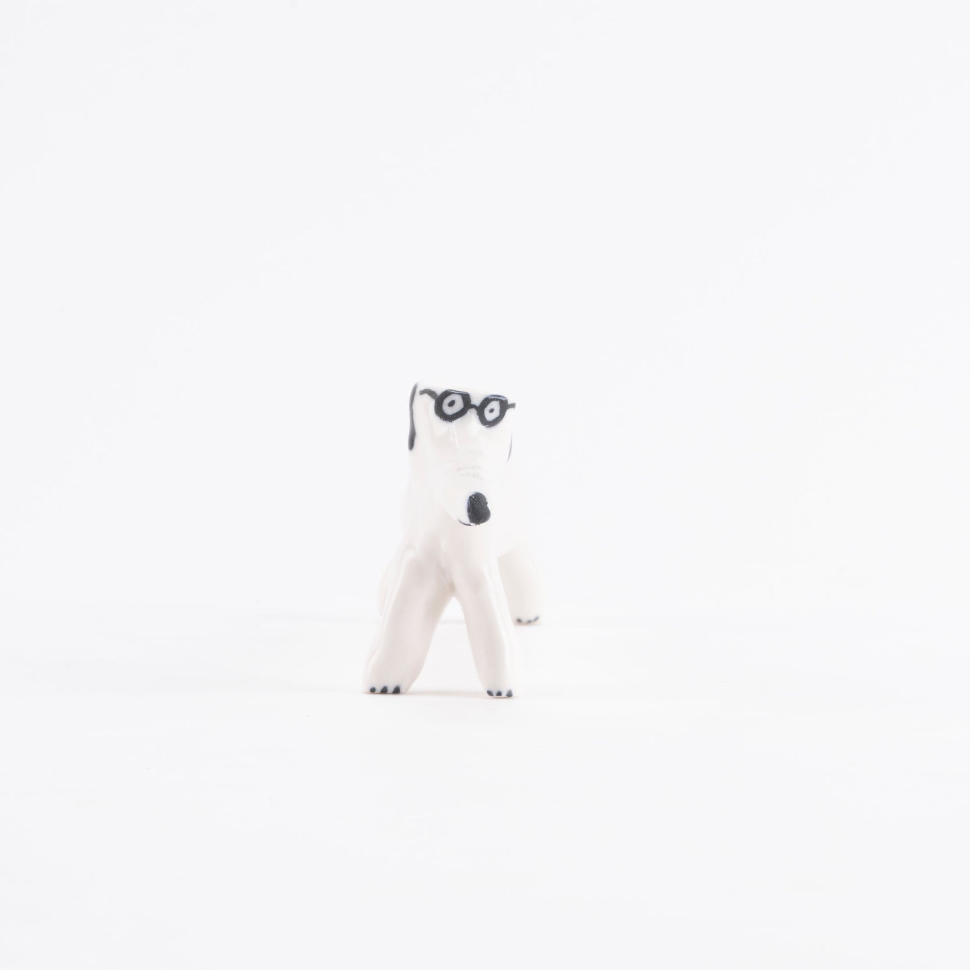 黒みみでメガネをかけた犬の花瓶。花瓶なので、頭の部分に花を生けることができます。頭の部分に数滴の水を入れて、小さな小さな草花を挿して飾ることができます。ワンコの頭にお花を生ける、そんな彼女のユーモアを楽しんでくださいね。