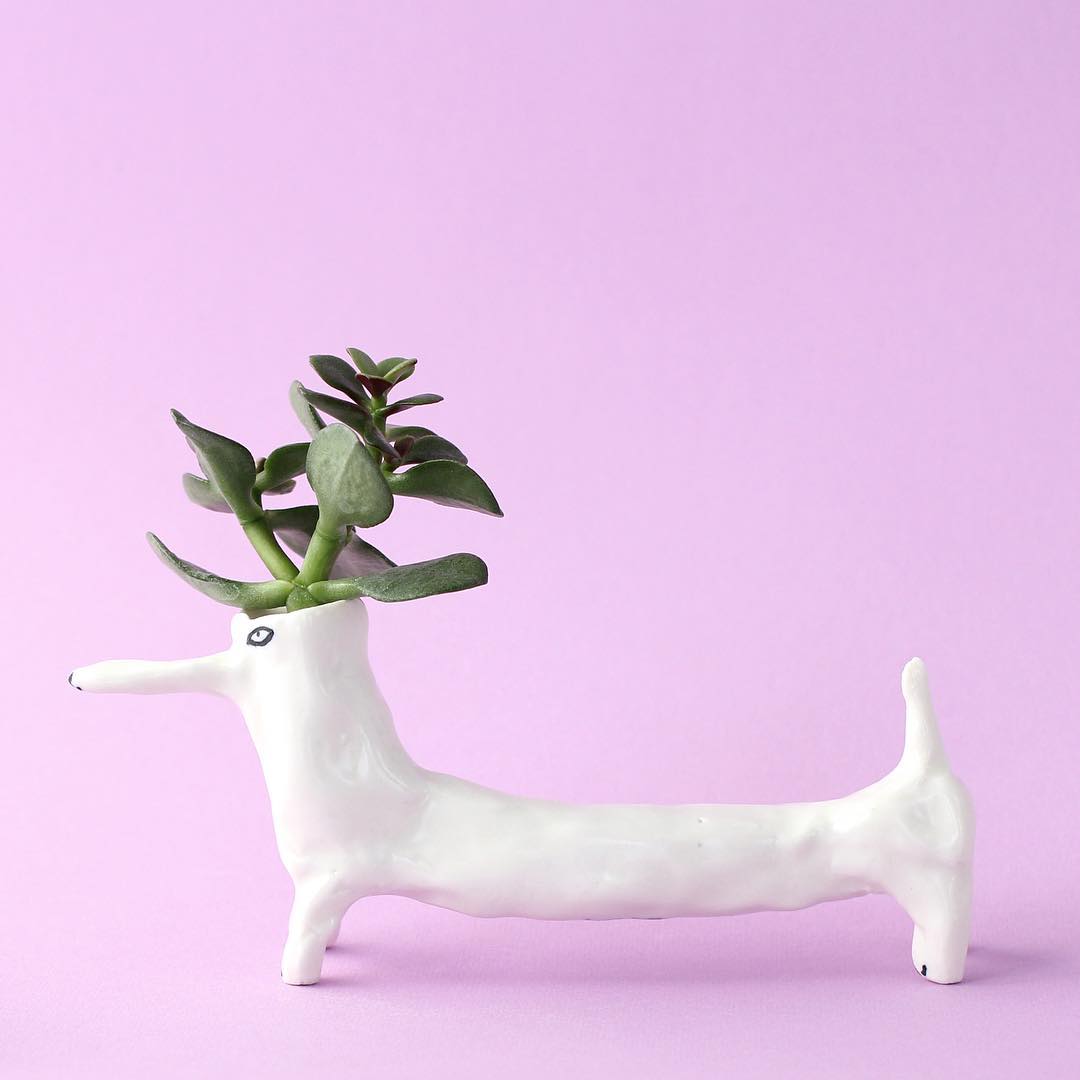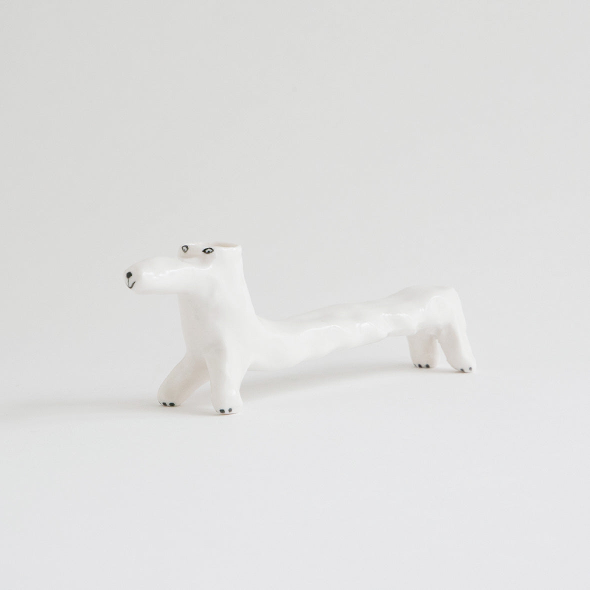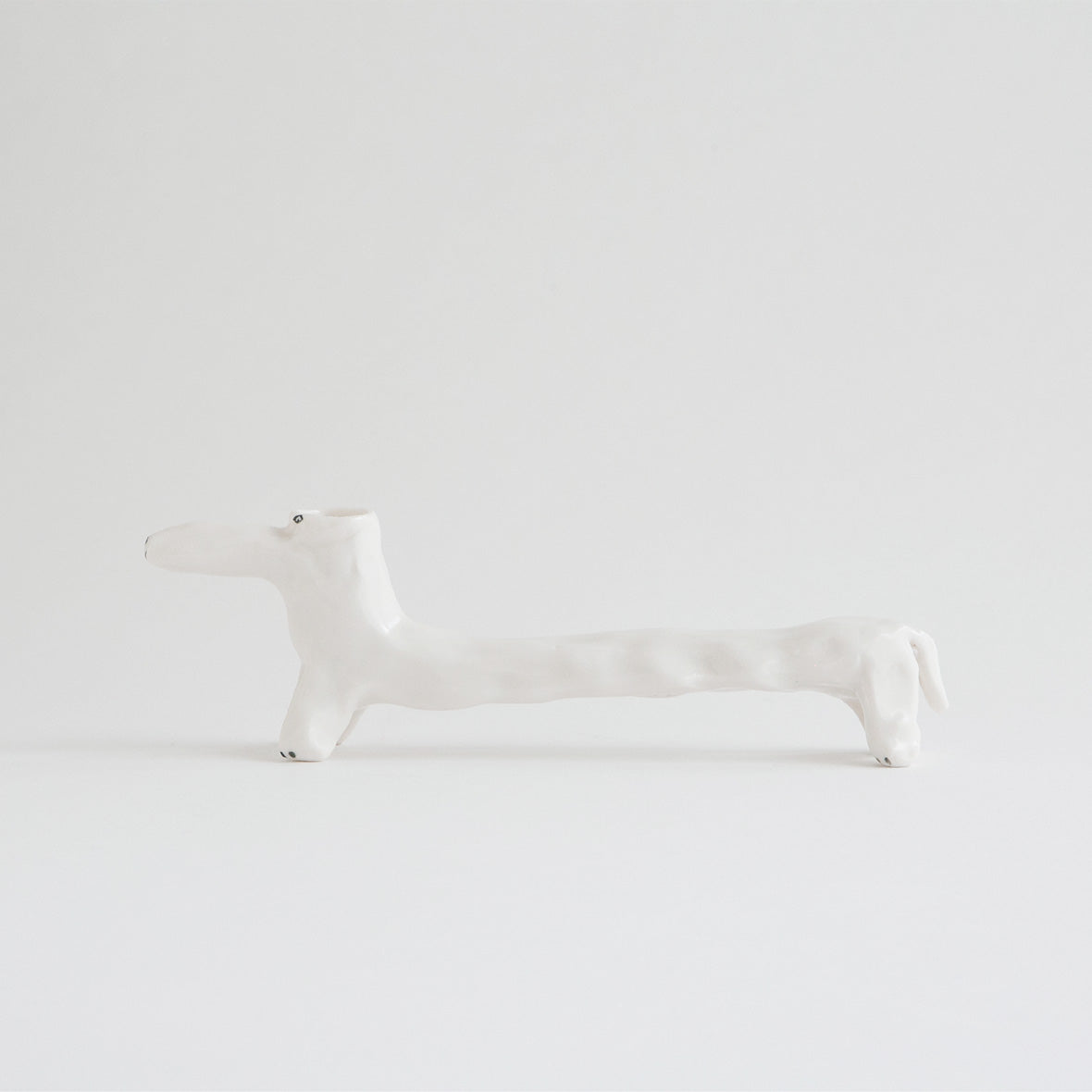 ダックスフンドのように長いボディをした犬の花瓶。花瓶なので、頭の部分に花を生けることができます。花瓶のようにして使うのはもちろん、長いボディの部分をどう使おうかな?と考えるのも楽しい作品。