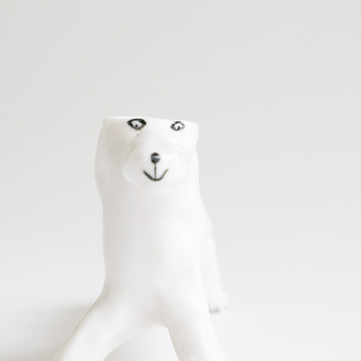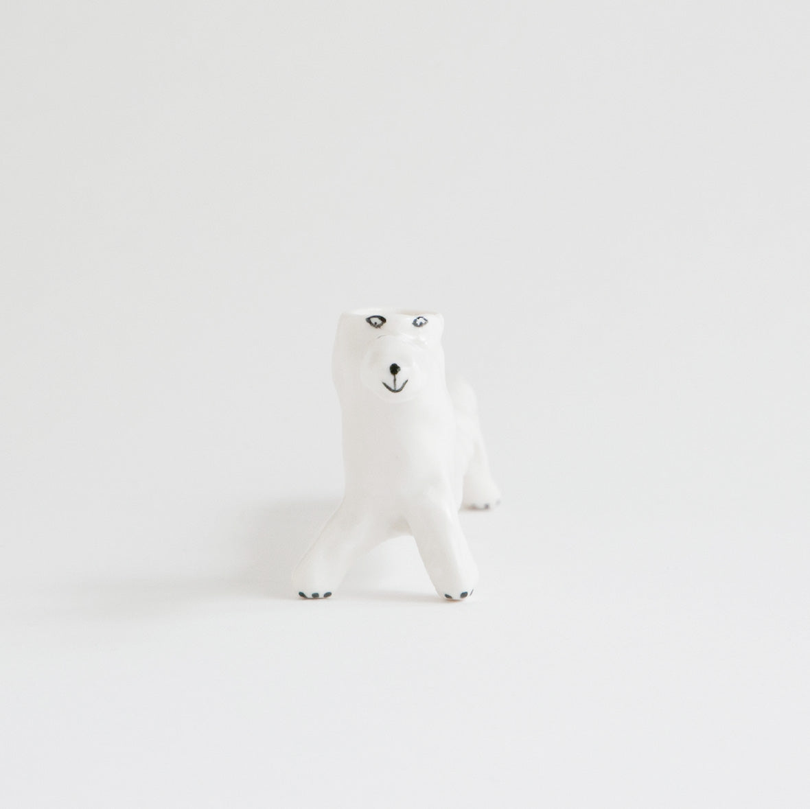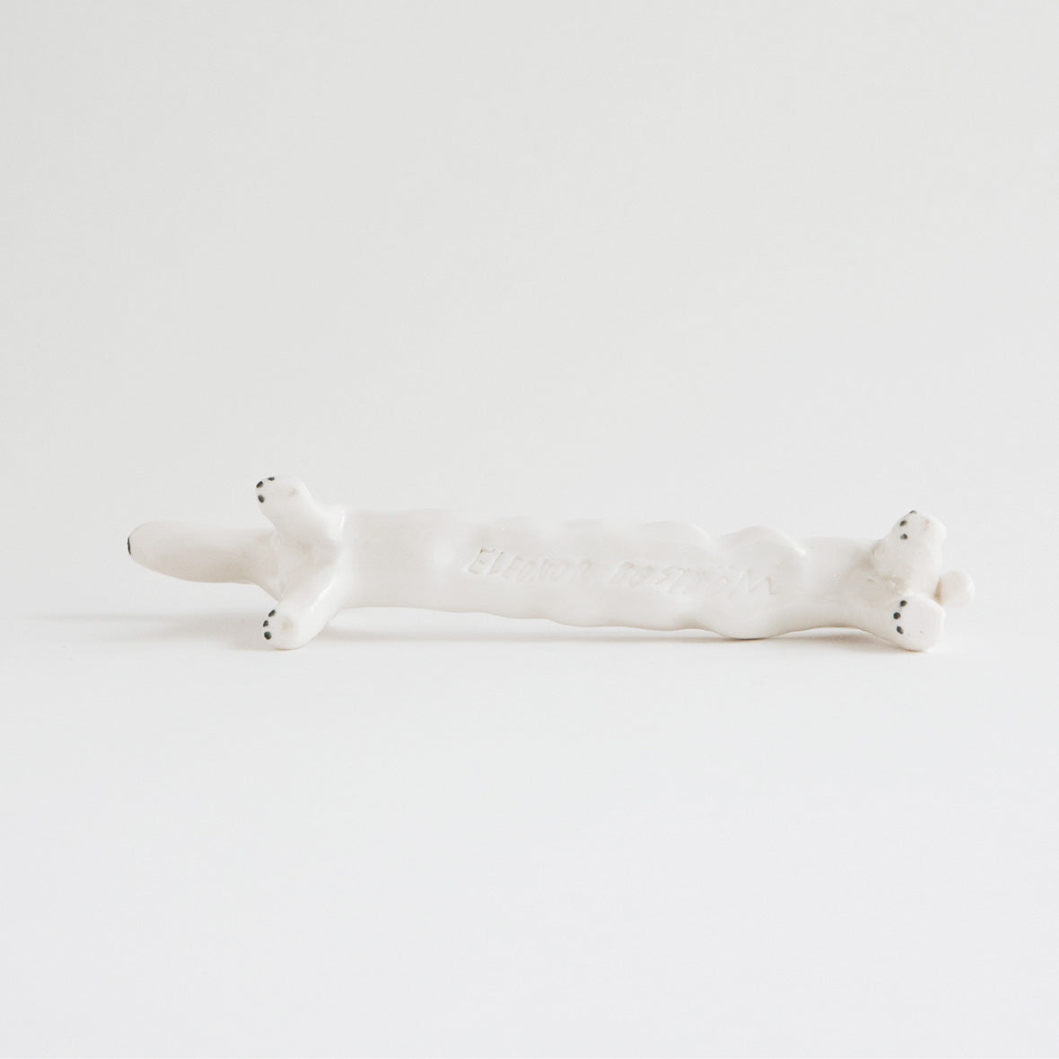 成形はもちろん、犬の表情などのディテールまで、全てエレオノールの手描きで丁寧に作られています。なんといっても、半透明の釉薬(ゆうやく)を使って素地を生かした仕上がりが彼女の作品の特徴。この花瓶は実用的な用途としてつくられたものではありませんので、彼女のユーモアを楽しんでくださいね。
