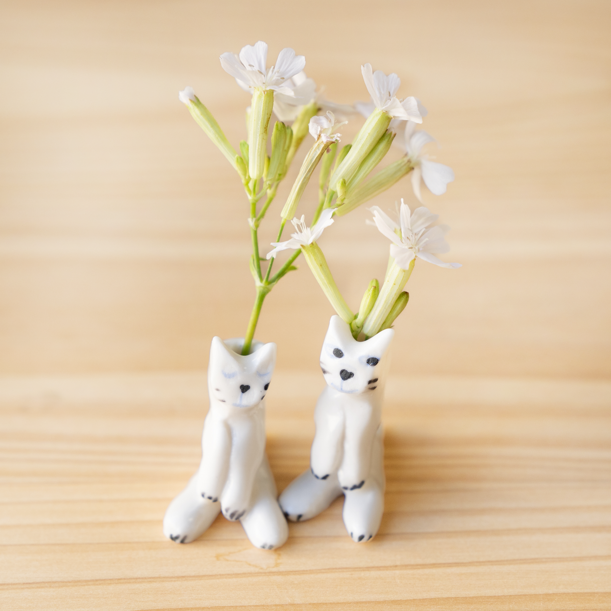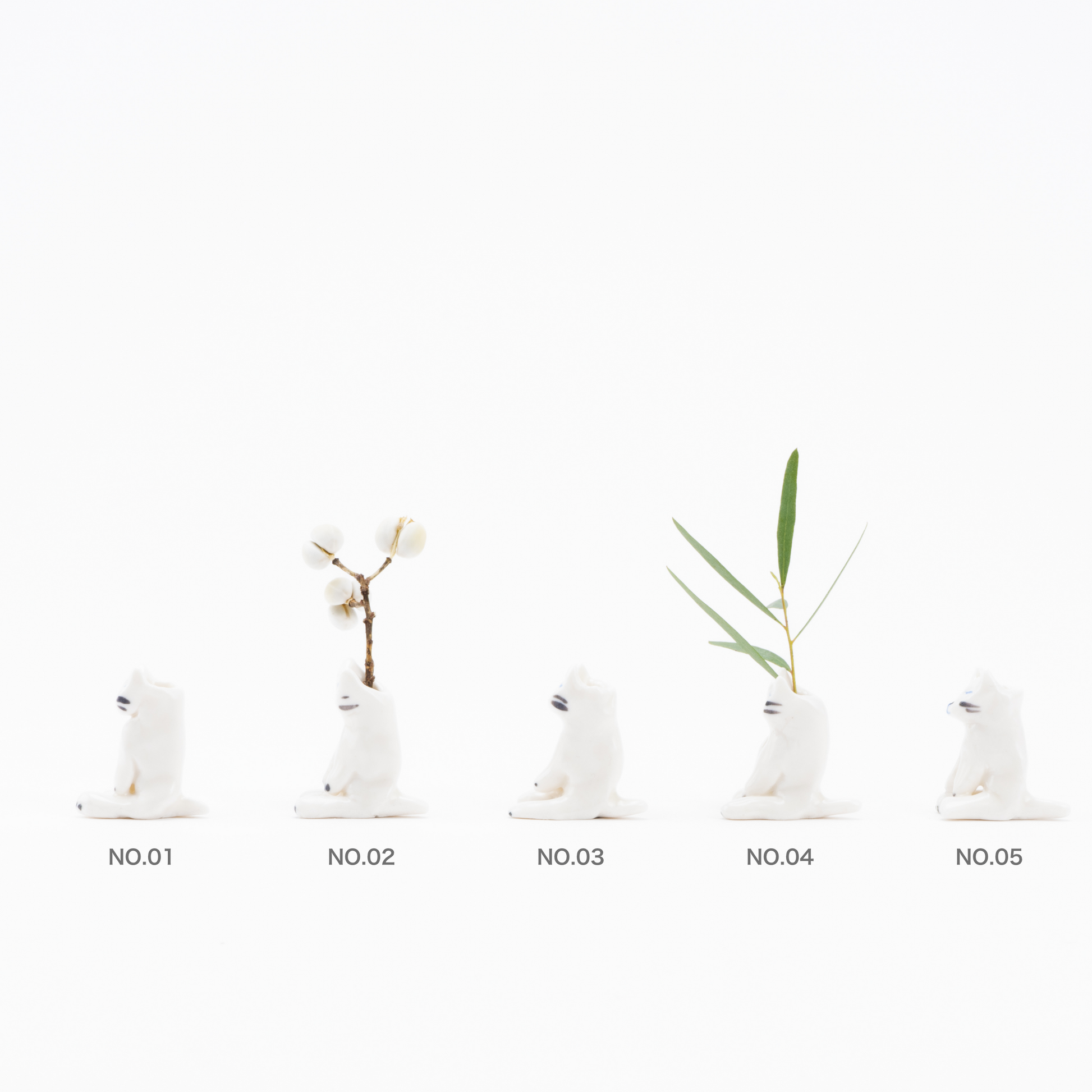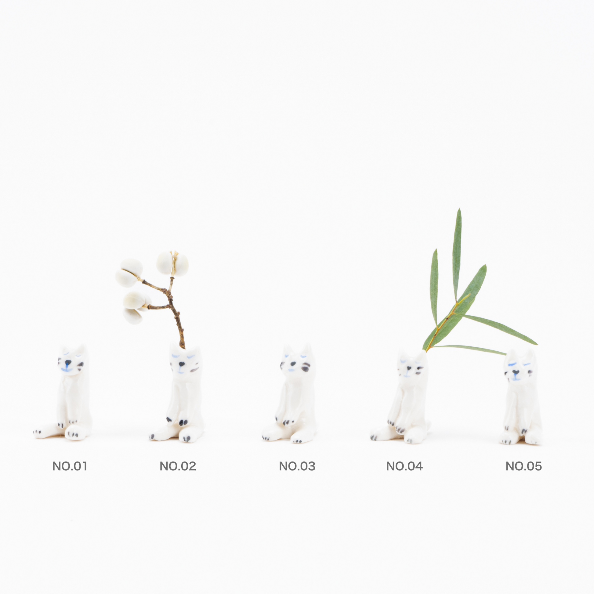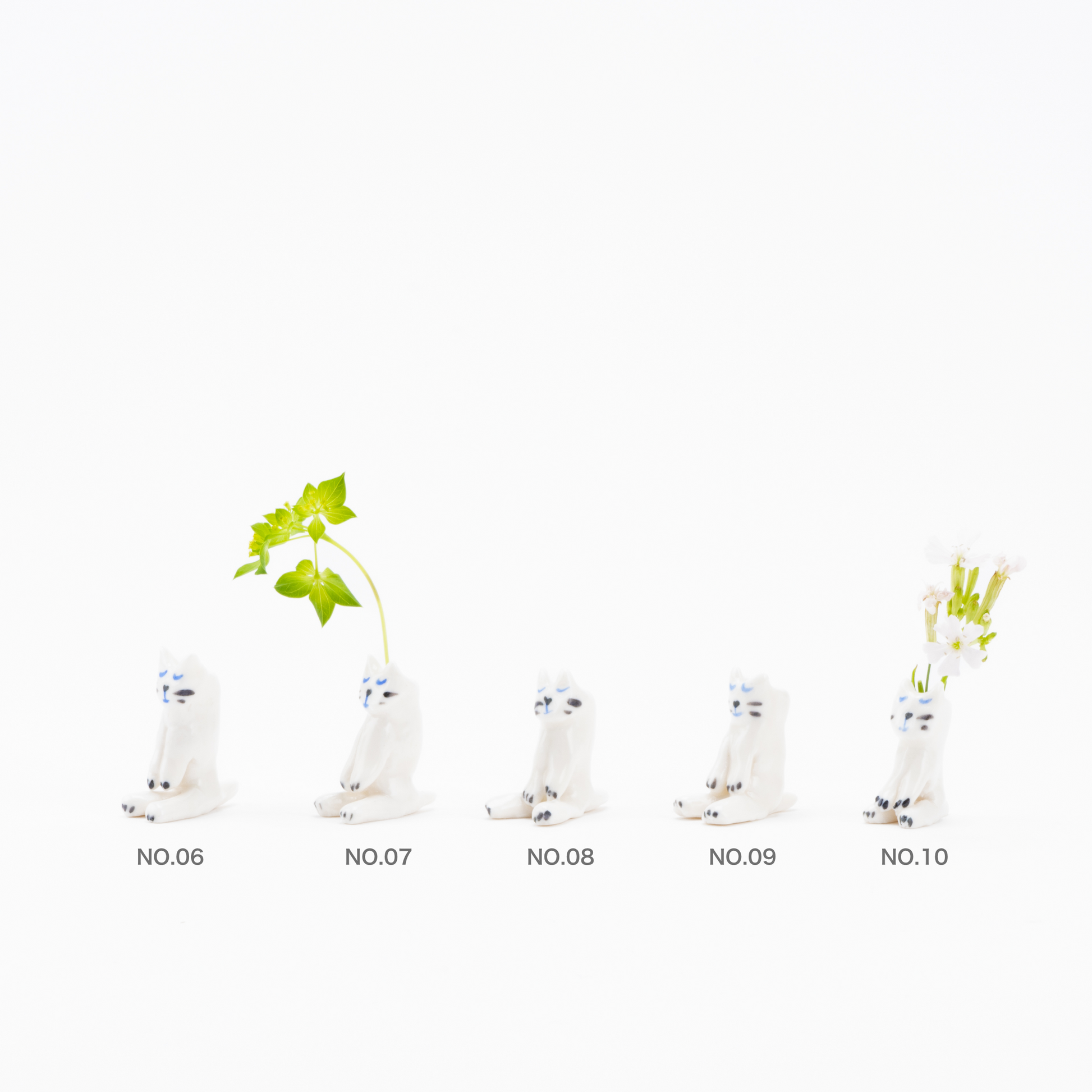 成形はもちろん、猫の顔の表情、ひとつひとつ全てエレオが大事に丁寧に作っています。実際に手に持ったときにも、彼女のぬくもりがほのかに伝わってきそう。すやすや目を閉じている子たちは、なんだかおじぎをしているようにも見えてきます。決して実用的とはいえない花瓶だけど、彼女のユーモアが存分に感じられる、その独特な世界観をぜひ味わってください。
