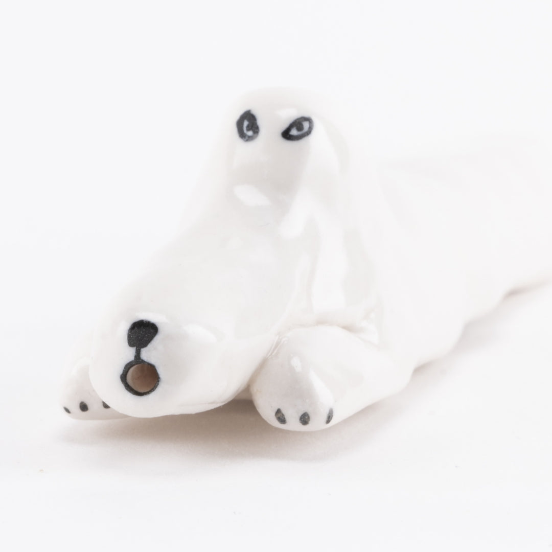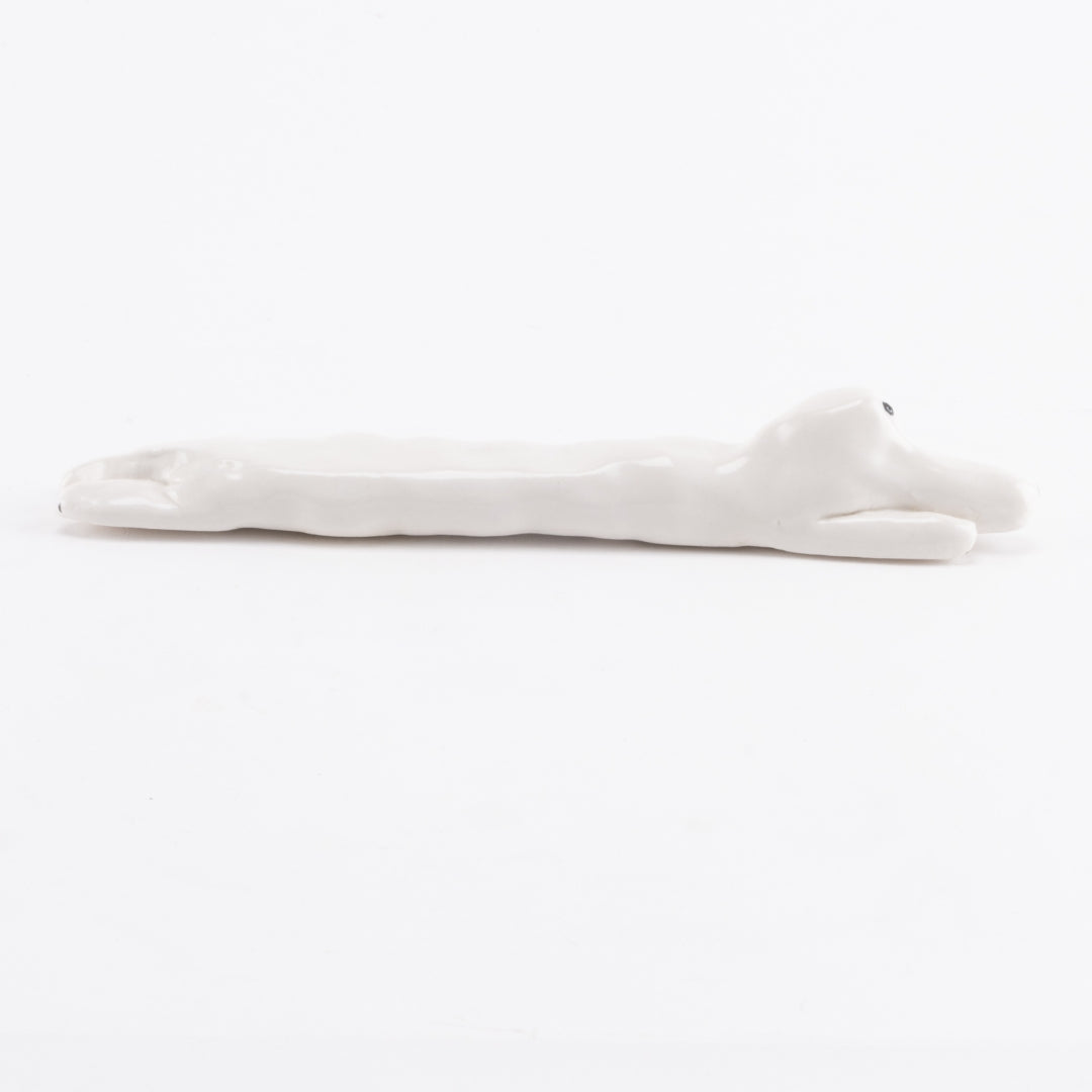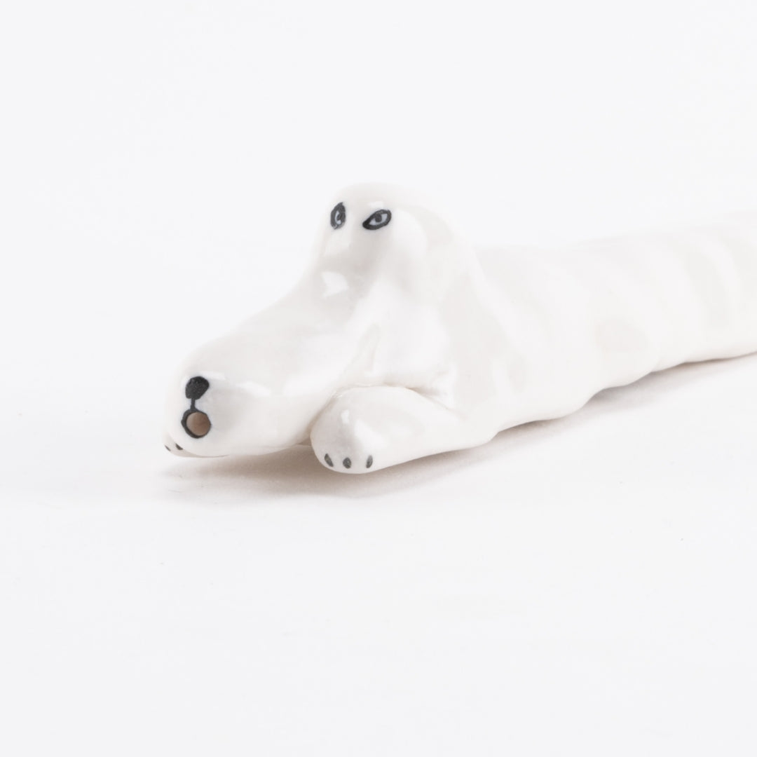 成形はもちろん、犬の表情などのディテールまで、全てエレオノールの手描きで丁寧に作られています。なんといっても、半透明の釉薬(ゆうやく)を使って素地を生かした仕上がりが彼女の作品の特徴。この花瓶は実用的な用途としてつくられたものではありませんので、彼女のユーモアを楽しんでくださいね。
