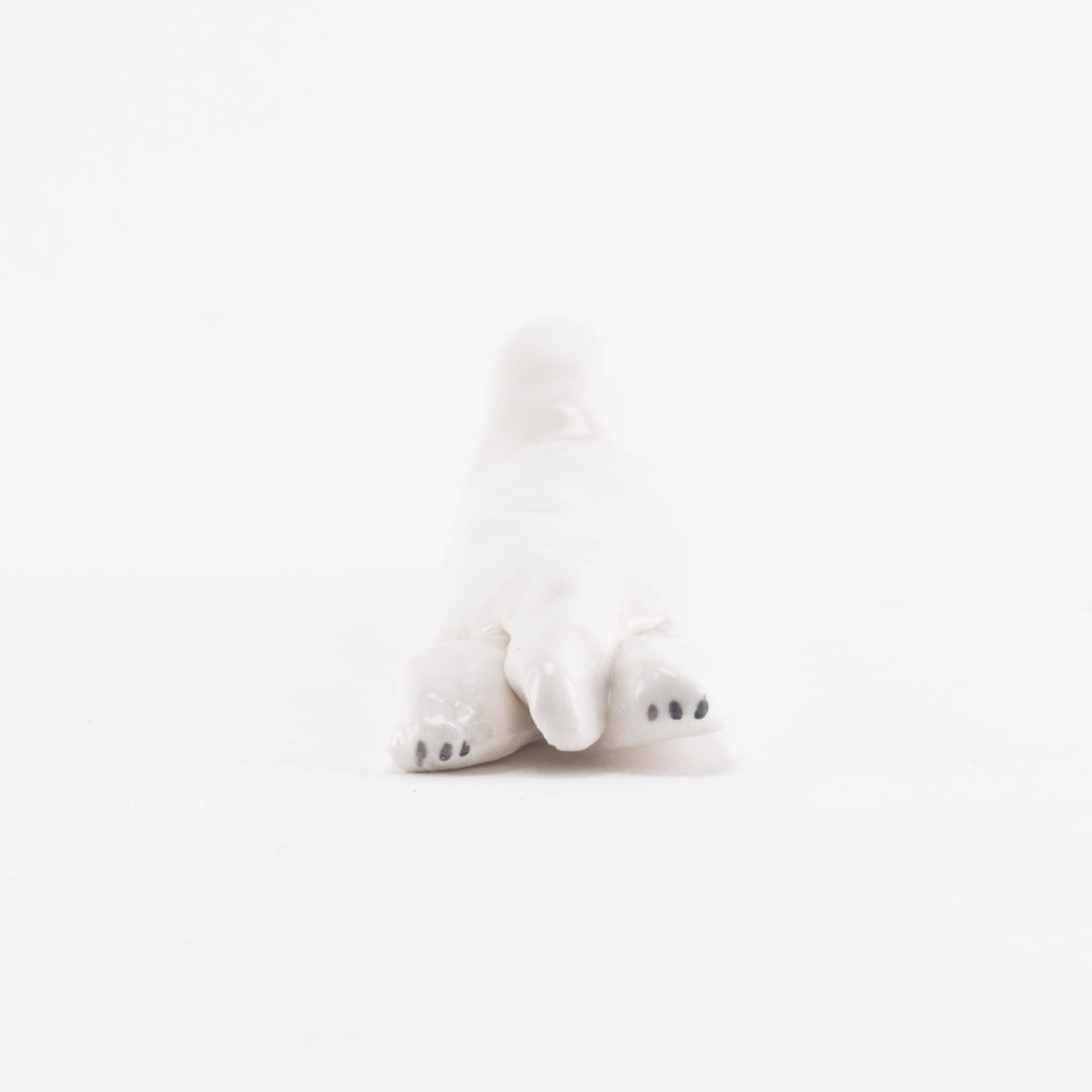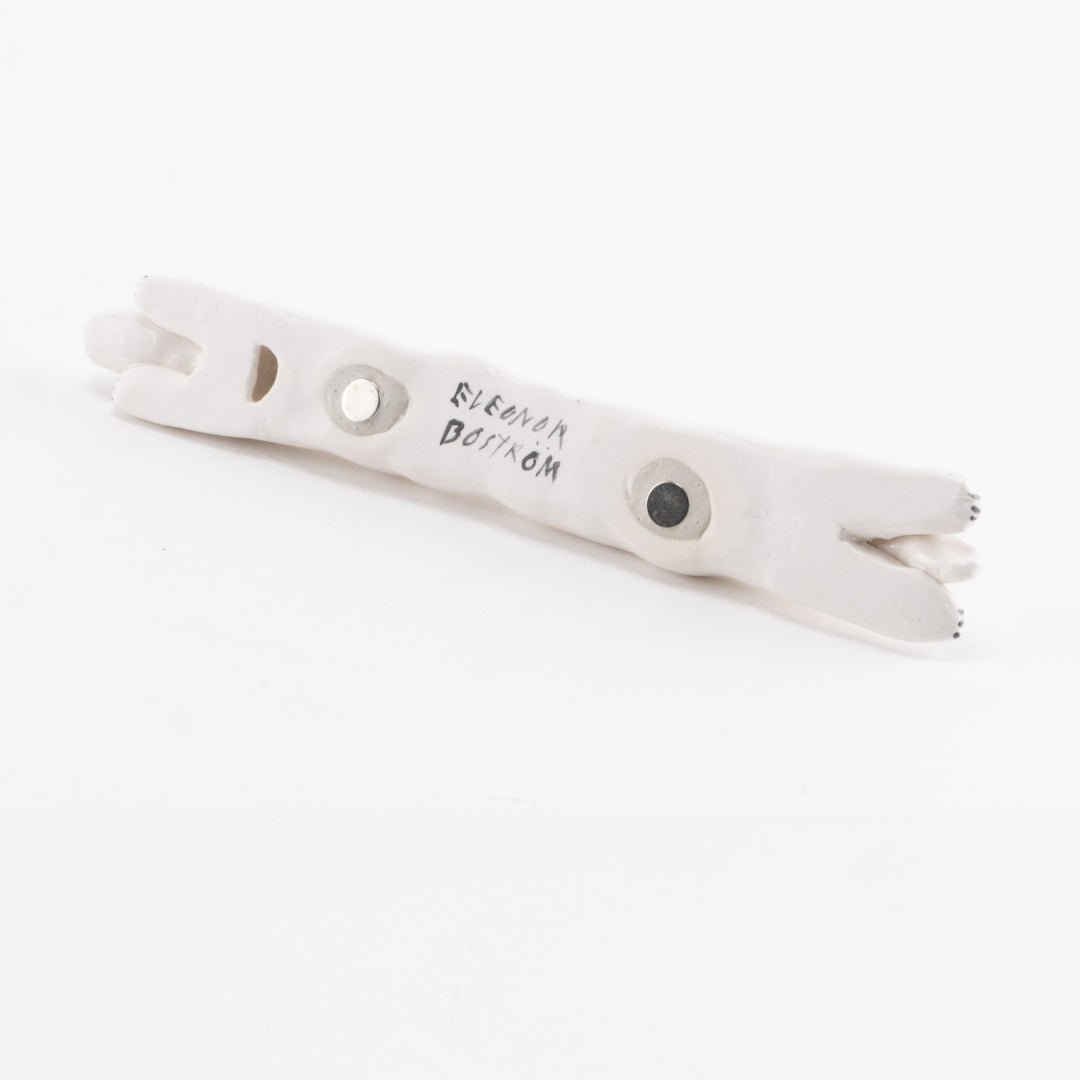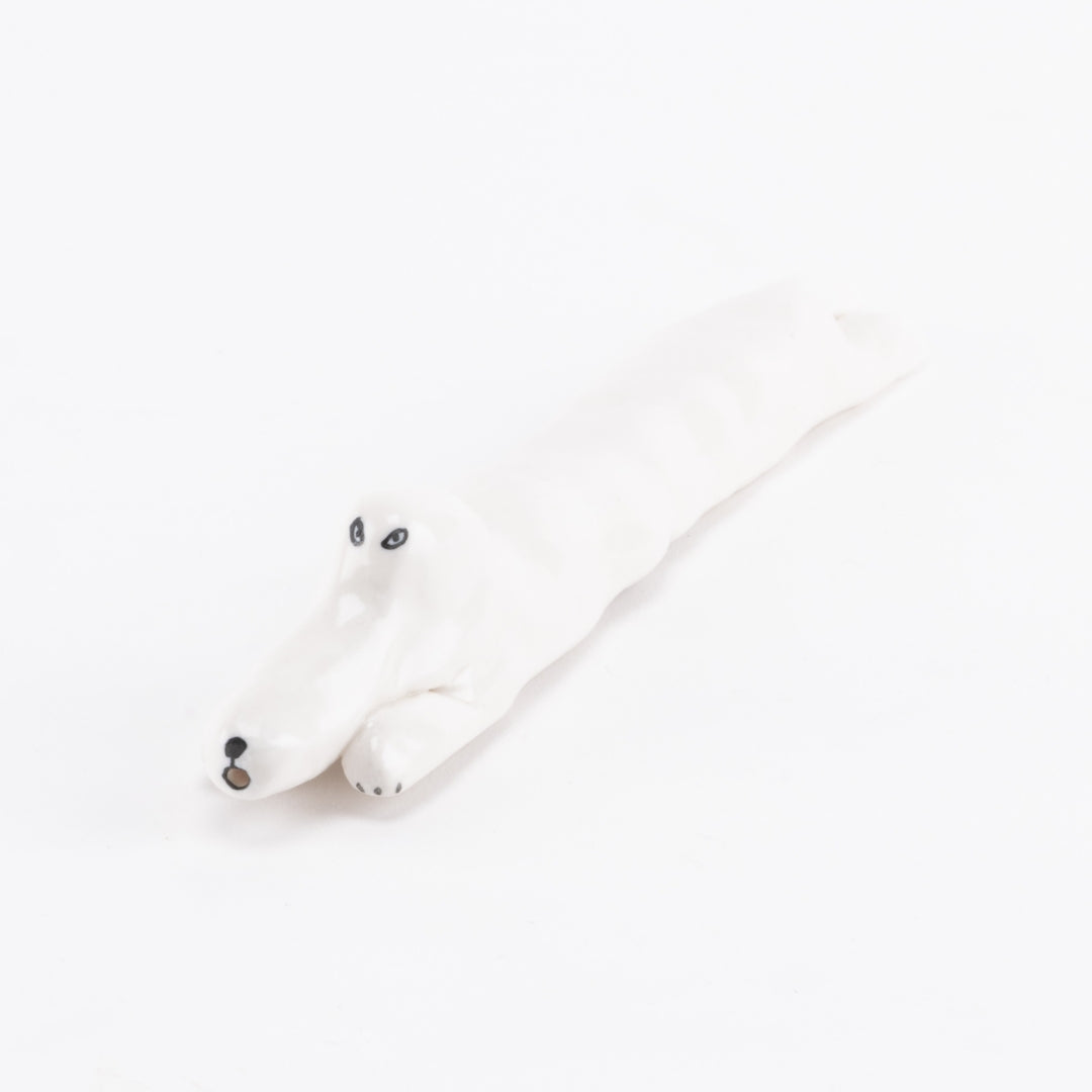 成形はもちろん、犬の表情などのディテールまで、全てエレオノールの手描きで丁寧に作られています。なんといっても、半透明の釉薬(ゆうやく)を使って素地を生かした仕上がりが彼女の作品の特徴。この花瓶は実用的な用途としてつくられたものではありませんので、彼女のユーモアを楽しんでくださいね。